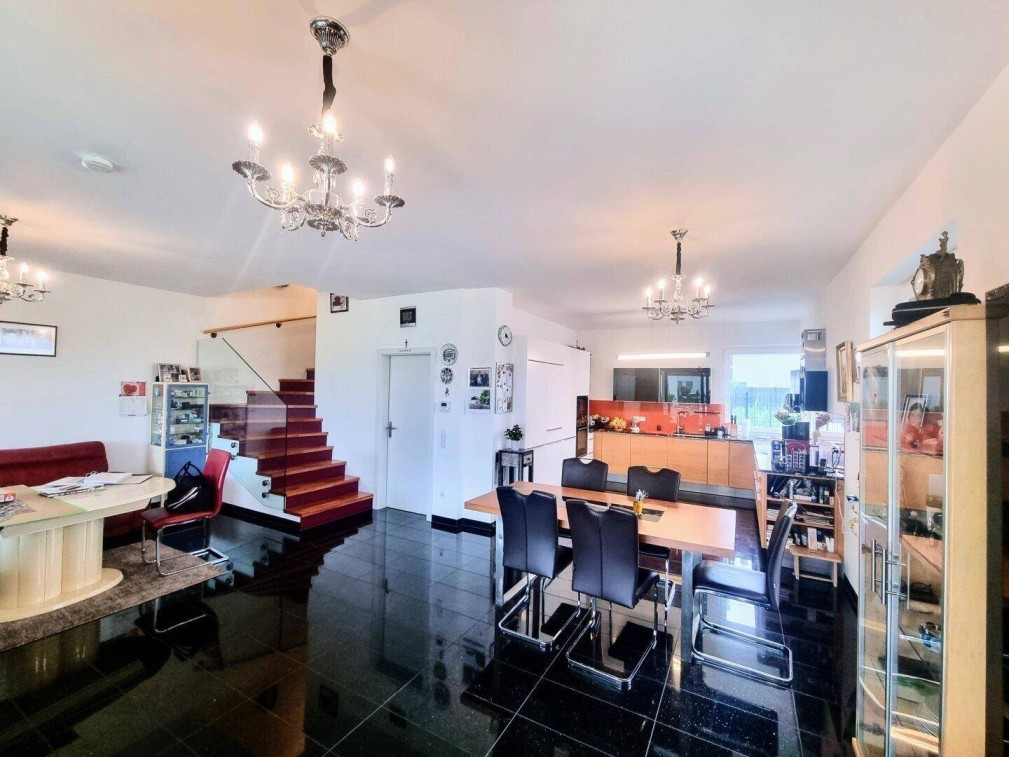Ruhig, privat und großzügig – das perfekte Zuhause für Familien.Diese stilvolle Immobilie vereint modernes Wohnambiente mit einer ruhigen, naturnahen Umgebung – der perfekte Rückzugsort für Paare oder Familien, die Wert auf Qualität, Komfort und Lebensqualität legen.Großzügige Glasfronten durchfluten die Wohnräume mit Tageslicht und schaffen eine freundliche, offene Atmosphäre. Die hochwertige Ausstattung, darunter eine energieeffiziente Luftwärmepumpe und Fußbodenheizung auf allen Etagen, garantiert ein angenehmes Wohngefühl zu jeder Jahreszeit. Zwei private PKW-Stellplätze runden das Angebot ab – kein mühsames Parkplatzsuchen mehr.Durchdachte Raumaufteilung auf drei EbenenErdgeschossGroßzügiger Eingangsbereich mit separatem Gäste-WC