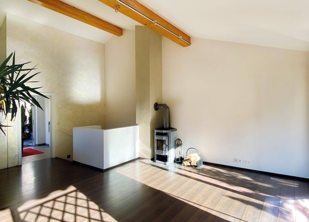 Die dritte Ebene ist dem persönlichen Rückzugsort gewidmet – dem Schlafzimmer. Hier genießt man nicht nur absolute Privatsphäre, sondern auch den direkten Zugang zu einer eigenen Terrasse und weiterführend zu einem kleinen Garten. Ein stiller, grüner Außenbereich, der diesen Wohntraum harmonisch abrundet. Das gesamte Grundstück hat eine Größe von ca. 1.309 m².