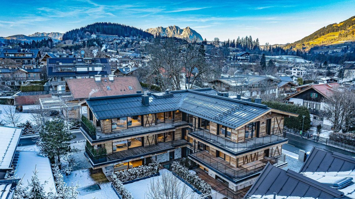Der moderne Neubau bietet den passenden Rahmen für das Kitzbühel-Erlebnis und vereint ein Townhouse mit eigenem Lift, ein Penthouse, eine Wohnung im Obergeschoss sowie zwei Maisonette-Gartenwohnungen mit einer Gesamtfläche von 200 m² bis 352 m².