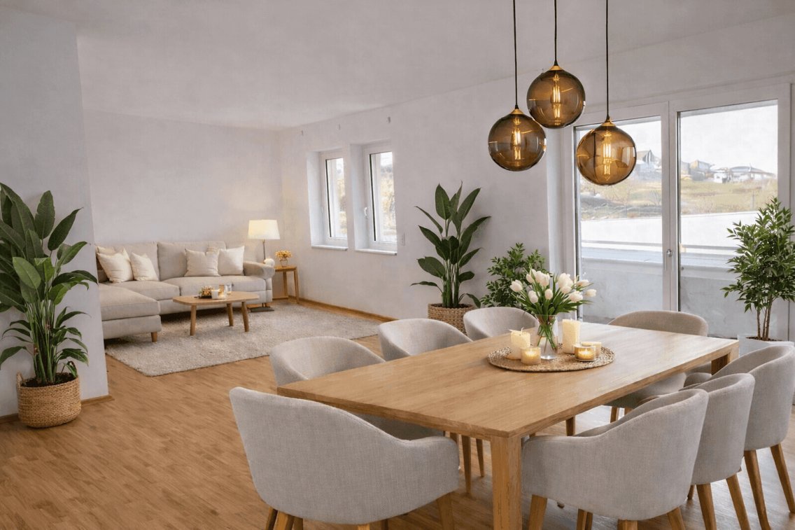 Der offene Wohn-, Ess- und Küchenbereich bildet den Mittelpunkt des Wohnens – ein Ort für gemeinsame Zeit, Gespräche und Alltag.