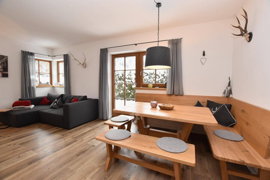 Der offen gestaltete Wohn-, Ess- und Küchenbereich bildet das Herzstück der Wohnung. Von hier aus haben Sie direkten Zugang zu zwei sonnigen Terrassen: Eine davon bietet einen traumhaften Blick auf den Kaiser, die andere liegt windgeschützt und uneinsichtig – perfekt, um die Sonne bis in die Abendstunden zu genießen.