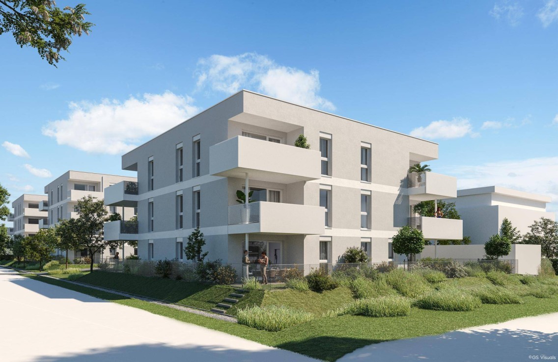 Alle Wohnungen haben großzügige Freiflächen in Form von Terrassen, Loggien und Balkonen, die Erdgeschosswohnungen verfügen über Eigengärten.
