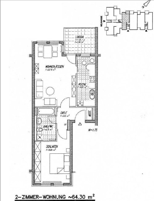 Schlafzimmer mit großem Kleiderschrank, Bad mit Badewanne, Utensilienschrank, zusätzlicher Fußbodenheizung und Anschluß für WM.