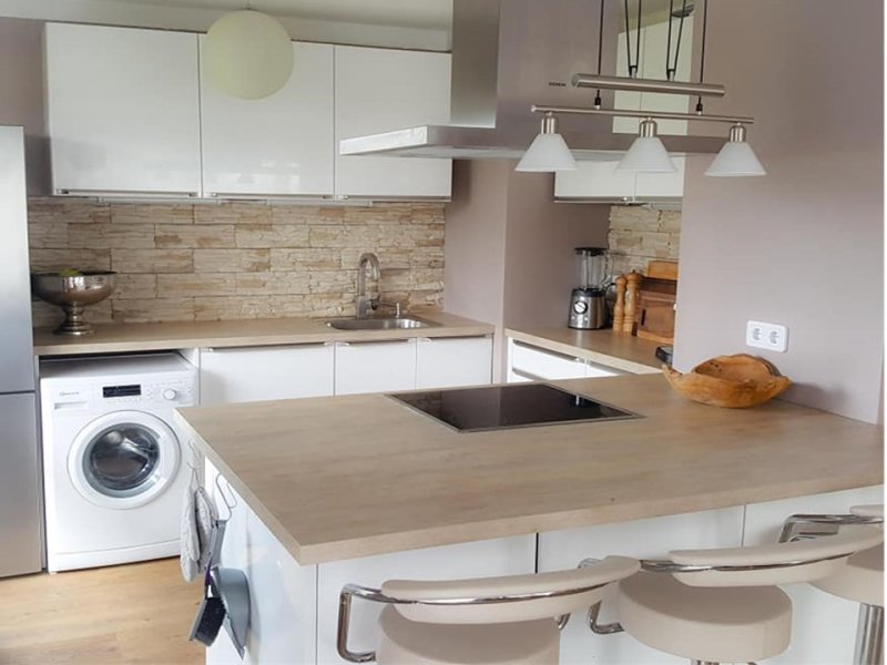 Kueche hochglanz weiss mit Kochinsel, Kuehlschrank, Waschmaschine, Spuelmaschine, Backofen,Ceranfeld, Dunstabzug alles Siemens