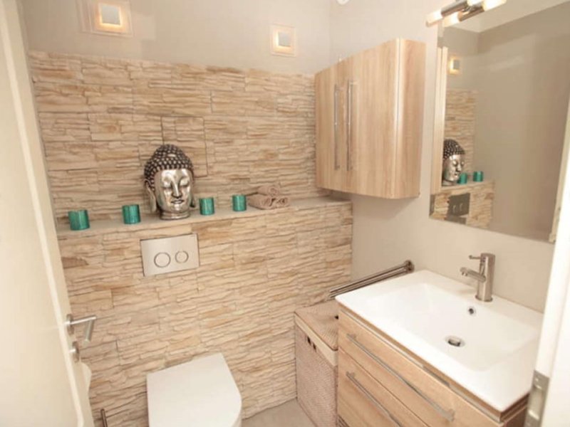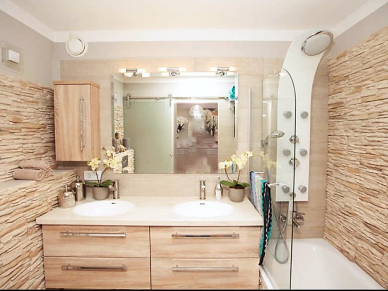 Bad mit Wanne und Wellnessdusche +WC, Corian Doppelwaschplatte und Gipswandverblender