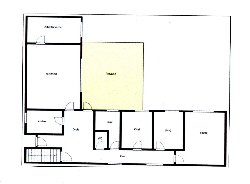 Der Grundriss ist gliedert in zwei Flügel mit mittig liegender zentraler Diele und Küche . In dem einen Flügel befinden sich Wohn- und Arbeitszimmer. Im Wohnzimmer garantiert eine breite Fensterfront (Südseite) Tageslicht, während ein Kaminofen im Winter für angenehme Wärme sorgt.