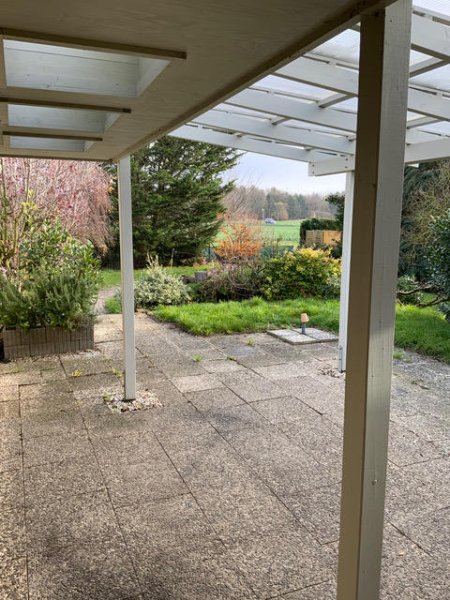 Zum Verkauf steht ein schöner L-förmiger Winkelbungalow in Braunschweig mit überdachter Terrasse.