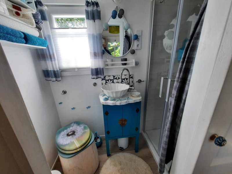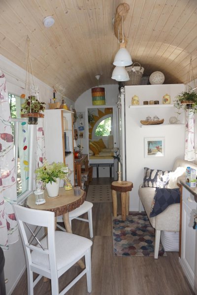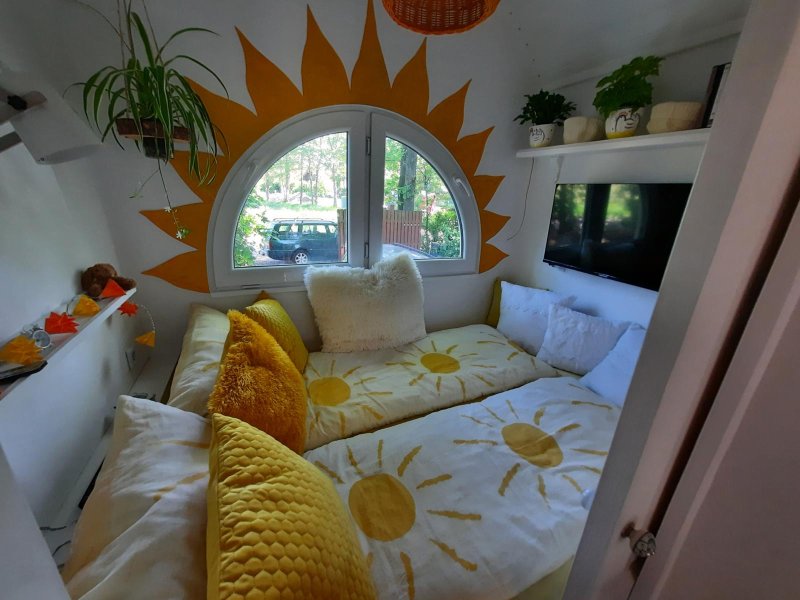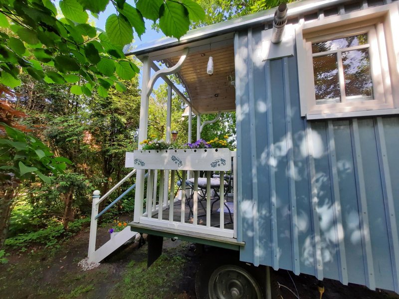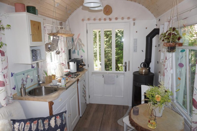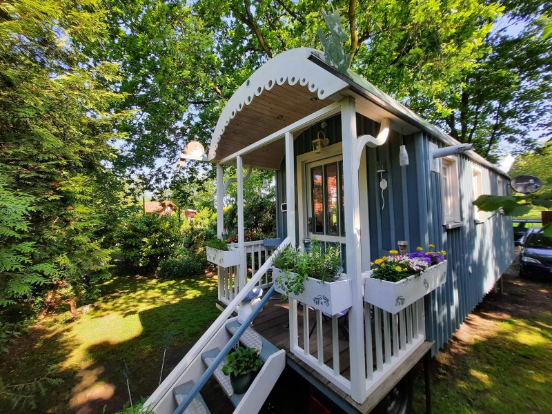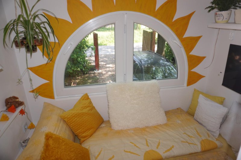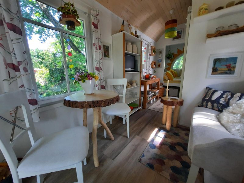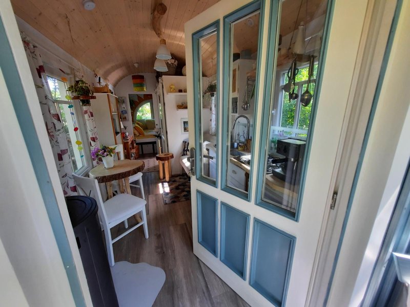 Das Tiny House verfügt über eine Vollausstattung und ist ganzjährig bewohnbar. Die integrierten Möbel-und Einrichtungsgegenstände sind überwiegend handgefertigt und speziell für dieses Mobilheim designt.