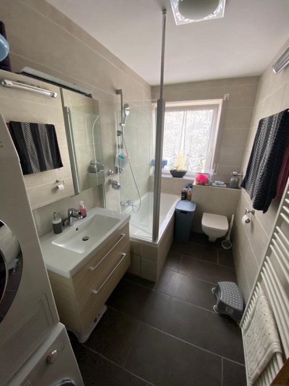 Die Whg. besteht aus 2 Schlafzimmern, 1 Wohnzimmer mit elektrischem Rollo, 1 Esszimmer mit elektrischem Rollo, 1 Balkon, 1 Bad mit Badewanne und Spiegelschrank und Waschbecken Unterschrank, 1 Küche mit einer Nolte Einbauküche, und einem kleinen Flur mit Abstellraum. Zudem ist noch ein großer verschließbarer Kelleranteil, ein Trockenraum und ein offener Dachbodenanteil dabei. In den Schlafzimmern, im Esszimmer, im Flur mit Abstellkammer und in der Küche wurde ein Vinylboden verlegt. Im Wohnzimmer liegt Parkett. Das Badezimmer wurde komplett neu gefliest.