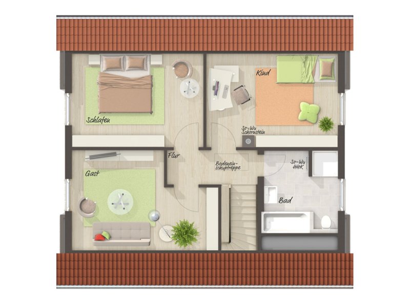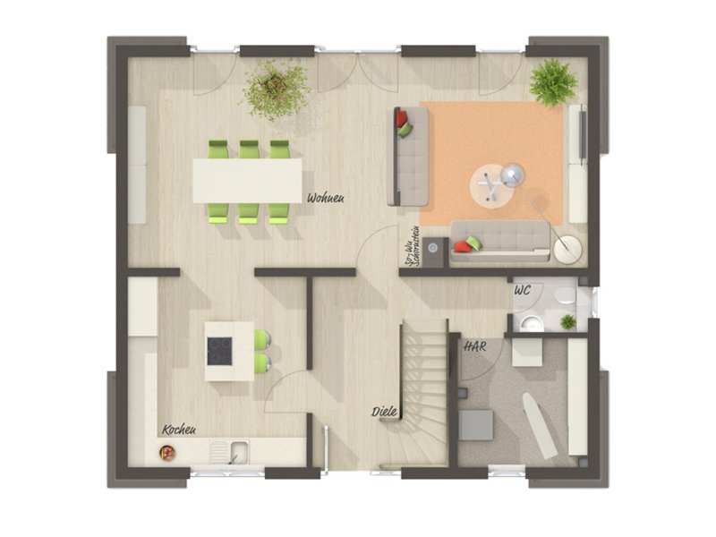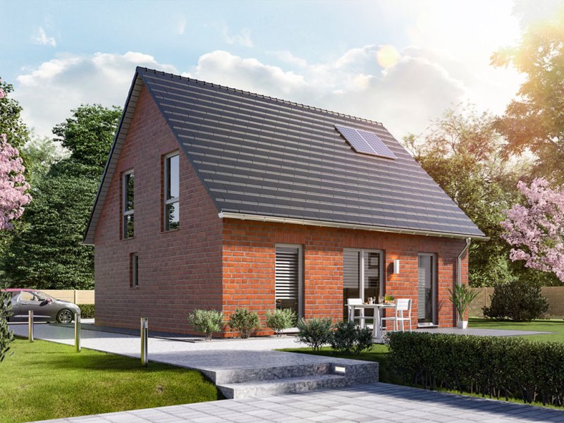 Das „Flair 130“ ist ein Klinkerhaus in dem Familien sich wohlfühlen. Im lichtdurchfluteten Wohnzimmer mit Essbereich und offenem Zugang zur Küche spielt sich der Familienalltag ab – vom gemeinsamen Frühstück bis zum gemütlichen Filmabend, hier kommen alle zusammen. Die Terrasse und der Garten sind nur einen kleinen Schritt weit entfernt. Im Obergeschoss findet jeder seinen Platz in einem der geräumigen Zimmer.