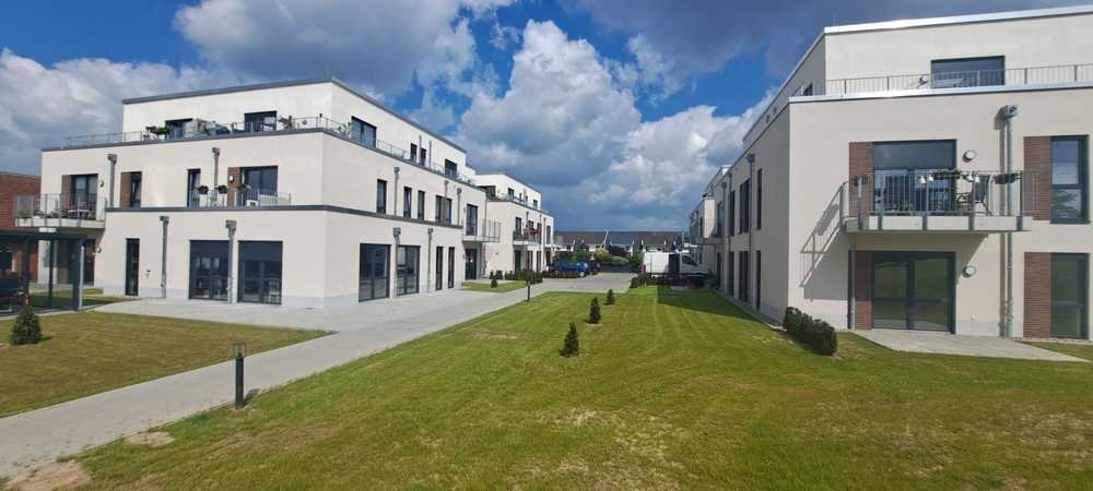 Im Sommer 2023 stehen dann auf drei Geschossen acht Penthouse-Wohnungen zwischen 82 und 87 Quadratmetern mit jeweils drei Zimmern und Dachterrasse zur Verfügung. Hinzu kommen 31 2-Zimmer-Wohnungen zwischen 60 und 75 Quadratmetern mit Balkon oder Terrasse. Alle Unterkünfte sind barrierefrei, acht sogar rollstuhlgeeignet. Per Aufzug gelangen Bewohner problemos in die oberen Etagen. Zur Ausstattung der Wohnungen gehören ein Notrufsystem, Fußbodenheizung, Designboden, elektrische Rollläden, ein Abstellraum, ein Waschmaschinenanschluss sowie Vollbäder mit bodenebenen Duschen. Alle Türen fallen breiter aus als gewöhnlich. PKW-Stellplätze sind vorhanden. Mieter profitieren von umfangreicher Hilfe rund um alltägliche Dinge wie Einkaufen, Waschen, Aufräumen, Blumenpflege, Essenszubereitung oder behördlichen Schriftverkehr. Im großen Gemeinschaftsraum werden regelmäßig Kultur- und Freizeitaktivitäten angeboten, angekündigt auf modernen Touchscreens in der Lobby. Eine Hausdame kümmert sich um persönliche Anliegen. „Die Lage der Häuser spricht für sich. Unmittelbar nebenan befinden sich Einkaufsmöglichkeiten, Friseur, Bushaltestelle, Geldautomat und ein Bäcker“. Eine Zweiraumwohnung ist ab 199.000 Euro zu haben, Penthäuser können ab 300.000 Euro erworben werden. .