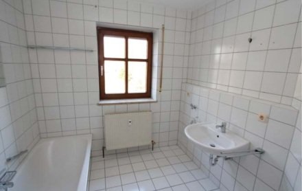 Zeitloses helles Bad mit Wanne, Waschmaschinenanschluss, Tageslichtfenster.