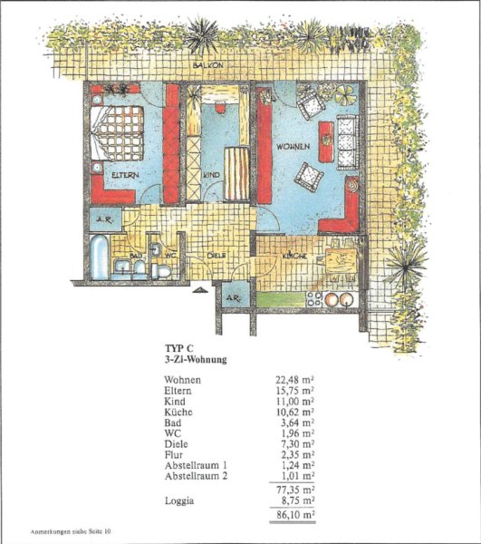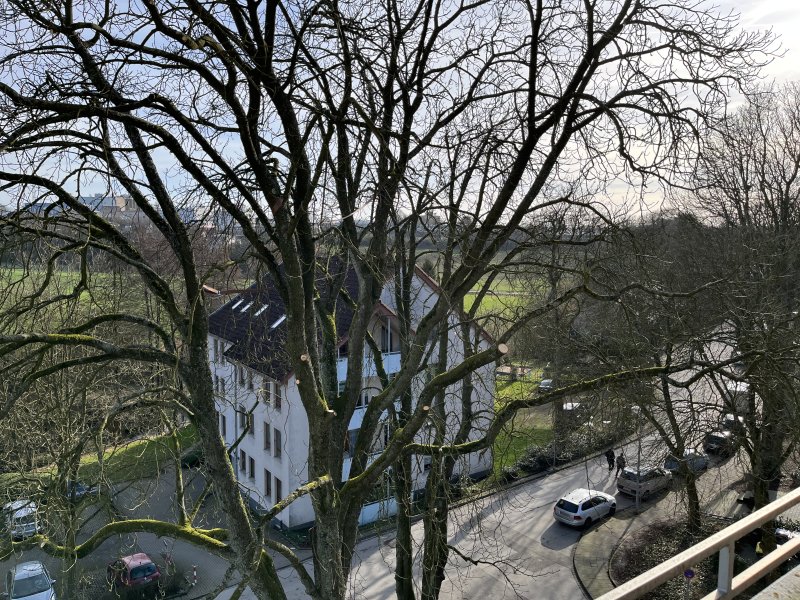 Die Wohnung ist teilrenoviert und verfügt über einen großen, über Eck liegenden Balkon mit unverbauten Ausblick auf das Feld. Durch die großen Fensterfronten ist die Wohnung auch ohne Beleuchtung bei Tage sehr hell.