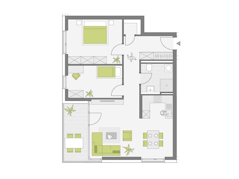 Die Wohneinheiten öffnen sich über helle, lichte Loggien und Terrassen zu einem großen Teil nach Süden und Südwesten. Bodentiefe Fenster ermöglichen die gewünschte Verschmelzung von Innen- und Außenraum. Offene Wohn-Essbereiche und großzügige Schlafräume erzeugen einen hochwertigen Wohnstandard.