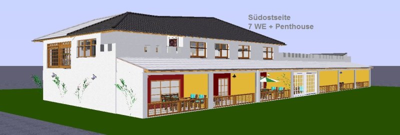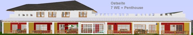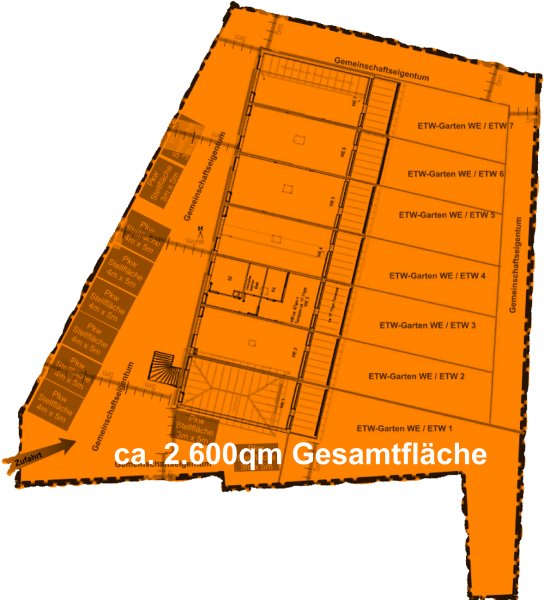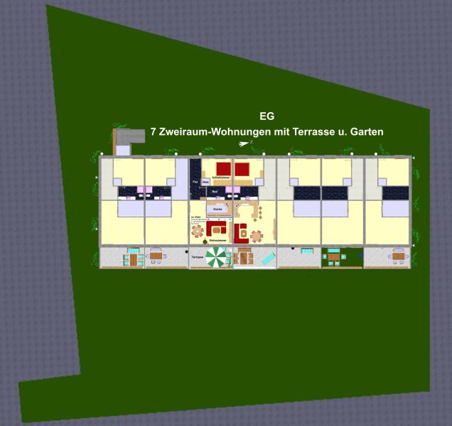 7 barrierefreie Zweiraumwohnungen (je ca. 67qm + überdachte Terrasse ca. 17qm + Garten an der Wohnung) + Pkw-Stellfläche je Wohnung.