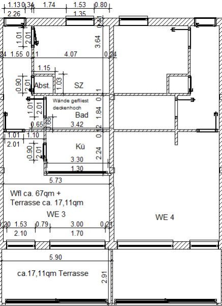 Die Errichtung der Wohnflächen soll in/auf einem ca. 43m langen, massiv errichteten Bestandsgebäude, mit zum Obergeschoss hin besonders tragfähiger Stahlbetondecke erfolgen (baurechtlich Nutzungsänderung). Das starke Mauerwerk des Bestandsgebäudes weist keine Setzrisse, keine aufsteigende Feuchtigkeit und keine sonst statisch relevanten, von uns erkannten Mängel auf.