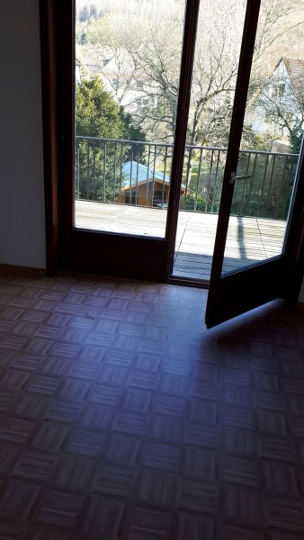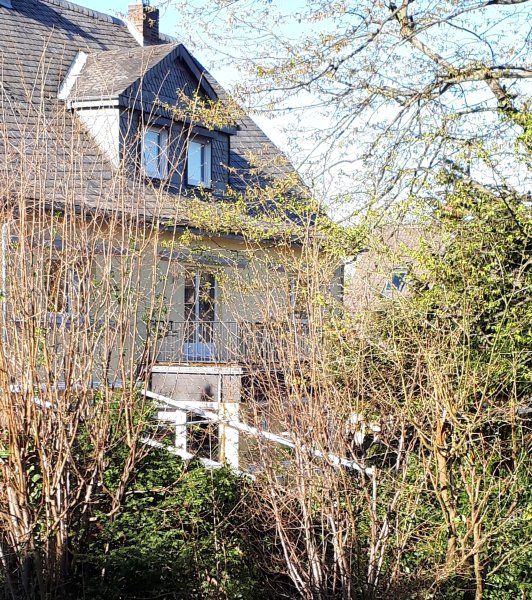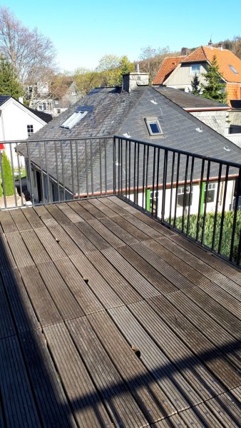 Großer Balkon mit Blick in den gepflegten Garten der Eigentümer und auf den Rammelsberg