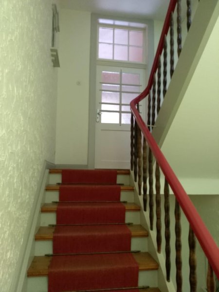 Gepflegtes großzügiges Holz-Treppenhaus mit großen licht-durchflutenden Fenstern