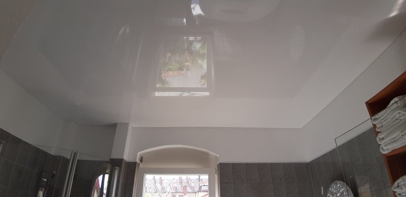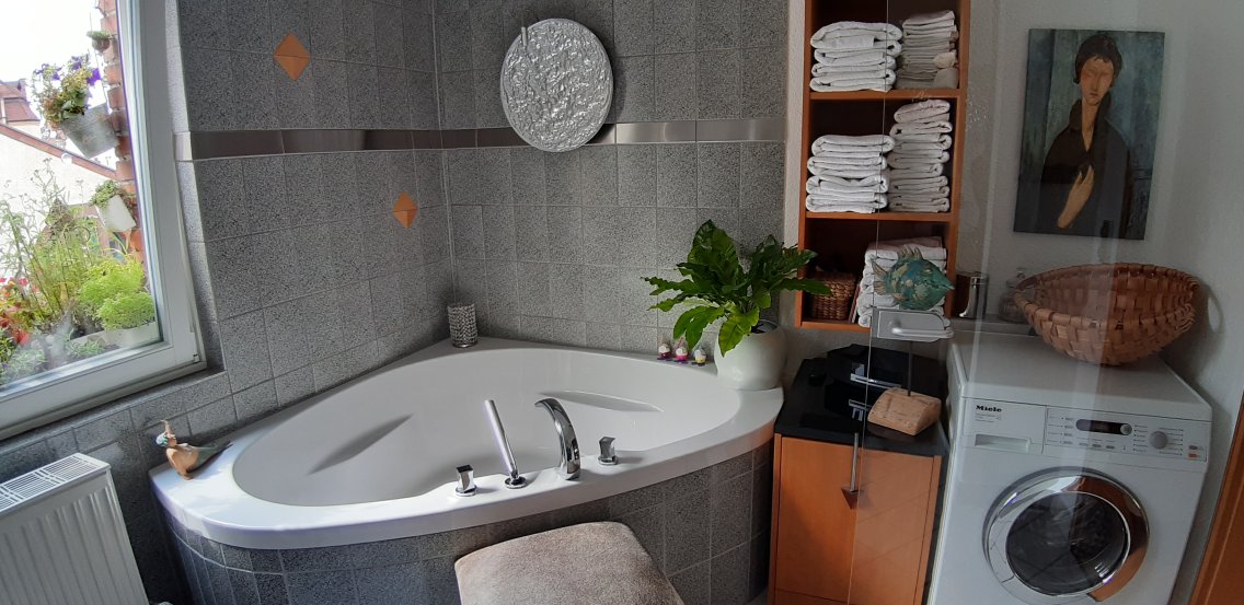 Im Tageslichtbad finden sich ebenfalls maßgefertigte Möbel. Der mit schwarzem Granit belegte Waschtisch ist mit Dornbracht-Armaturen ausgestattet. Neben der Eckbadewanne findet sich noch eine mit Glastüren abgetrennte Dusche. Die weiße Spanndecke komplettiert die hochwertige Ausstattung.