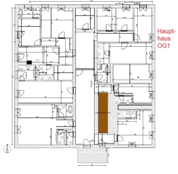 Je Haus EG, OG1 und 2 OG so wie DG bei einem ohne Ausbau, beim anderen Teilausbau. Es sind 33 Zimmern, 23 Bäder.