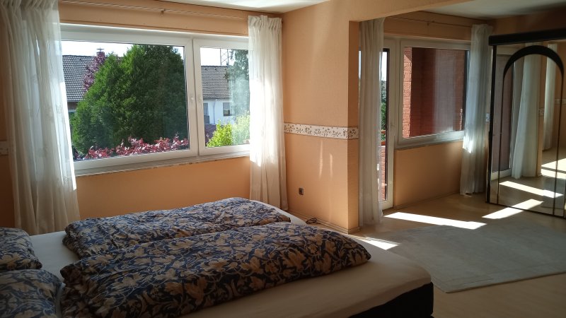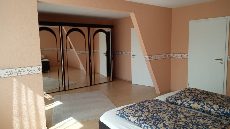 Das Obergeschoss ist wahlweise über die Treppe in der Diele oder über die Treppe im Eingangsbereich erreichbar und bietet ein großes Schlafzimmer mit Zugang zum überdachten Balkon sowie ein weiteres Zimmer und ein Badezimmer mit Eckbadewanne und großzügiger, begehbarer Dusche.