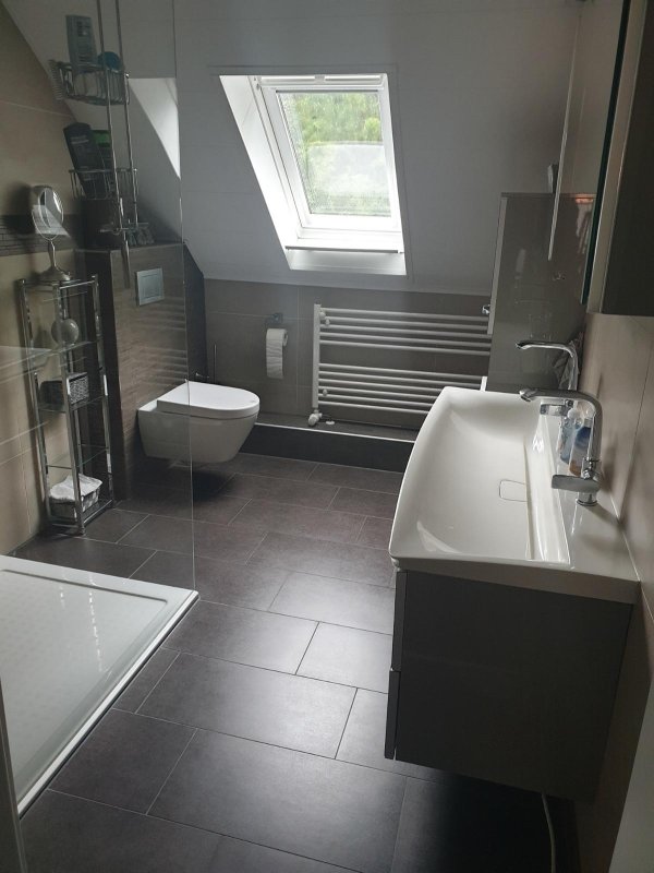 Das moderne Badezimmer mit exklusiven Badmöbeln wird Sie begeistern; unter der geräumigen Regenwalddusche wird das tägliche Duschen zu einem wahren Wellness-Erlebnis.