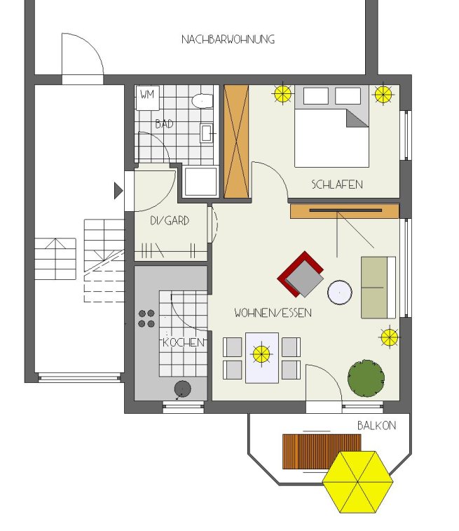 Die Wohnung hat einen Eingangsbereich, ein Schlafzimmer, einen Ess-/Wohnbereich, Küche, ein Bad mit Dusche und einen Zugang vom Ess-/Wohnbereich auf den eigenen Balkon. Zur Wohnung gehört zusätzlich eine kleine Abstellkammer (außerhalb der Wohnung). Nebenräume wie Fahrradabstellplatz und Trockenraum für Wäsche sind in einem Gemeinschaftsraum nutzbar.