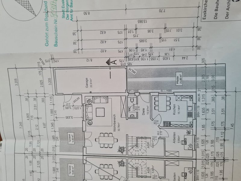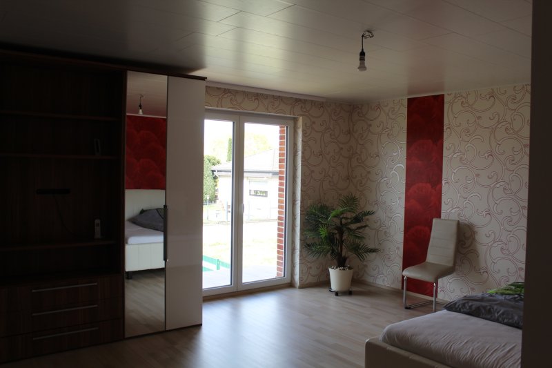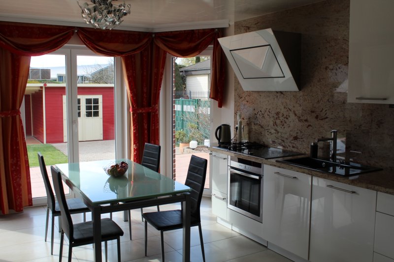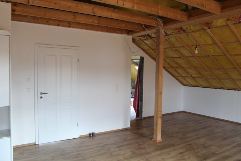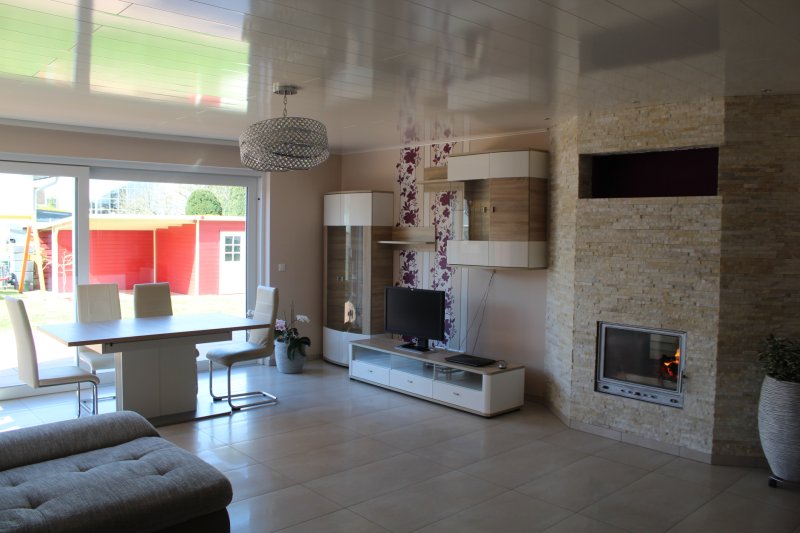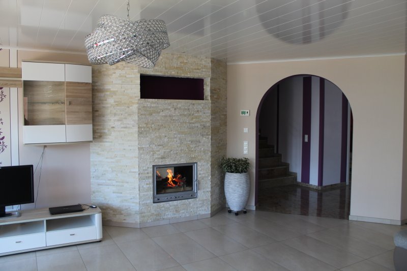 Das Erdgeschoß ist überwiegend mit schönen großen hellen Fliesen gefliest. Die Flure und das Treppenhaus sing einheitlich mit hellen Granit (Shivakashi) gestaltet. Die Schlafzimmer bestechen mit ihrer großzügigen Größe und weisen einen hellen freundlichen Laminatboden auf. Das Wohnzimmer besticht durch eine große Schiebetüren Fensterfront. Dazu bietet der Wasserführende Tunnelkamin an kalten Tagen eine wohlige und Heizung unterstützende Atmosphäre. Der Tunnelkamin verbindet das Wohnzimmer so wie die Küche, so dass egal, wo sie sich aufhalten, sie das schöne Kaminfeuer genießen können. Die Küche ist mit einer Einbauküche der Firma Nolte ausgestattet und sie können mit einem Gasherd oder Induktionsherd kochen. Die Einbauküche ist in Hochglanz Weiß gehalten, die Arbeitsplatte so wie die Rückwand sind mit ( Shivakashi) Granit passend zur Verzierung des Tunnelkamins gestaltet. Ein großzugiger Abstellraum so wie die Garage sind mit der Küche und Terrasse Verbunden. Das Dachgeschoß ist zum Teil ausgebaut.