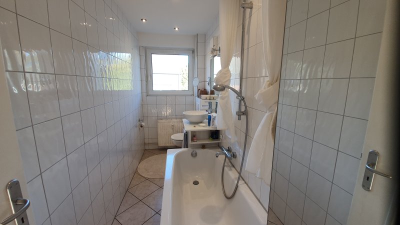 Das weiträumige Bad mit Fenster und Badewanne ist zeitlos weiß gefliest. Hier wurde die Badarmatur inkl. Duschanschluss und die Duschstange 2021 hochwertig modernisiert. Die Zulauf- und Ablaufrohre sowie das Hänge-WC wurden 2015 erneuert.