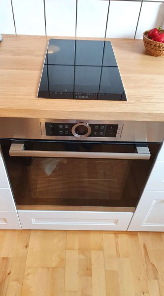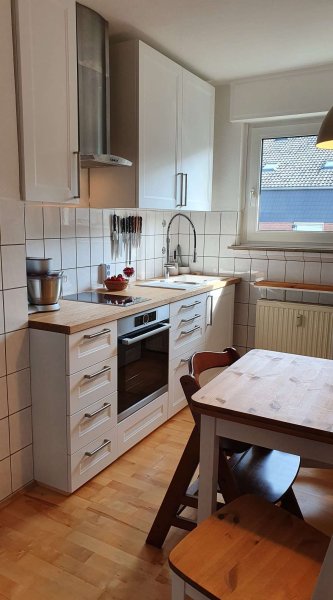 Küche bietet Platz für einen kleinen Esstisch und verfügt über eine neuwertige moderne Einbauküche im Landhausstil (2 Jahre alt) sowie viele hochwertige Elektrogeräte (wie Induktionskochfeld, Backofen, LED-Leiste, freistehende Spülmaschine, großer Kühlschrank, etc.