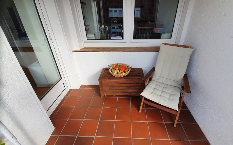 Die Südwest-Loggia (2021 neu gestrichen und mit einer manuellen Markise versehen) lädt zum Verweilen ein – besonders im Sommer ein Genuss mit herrlichen Sonnenuntergängen.