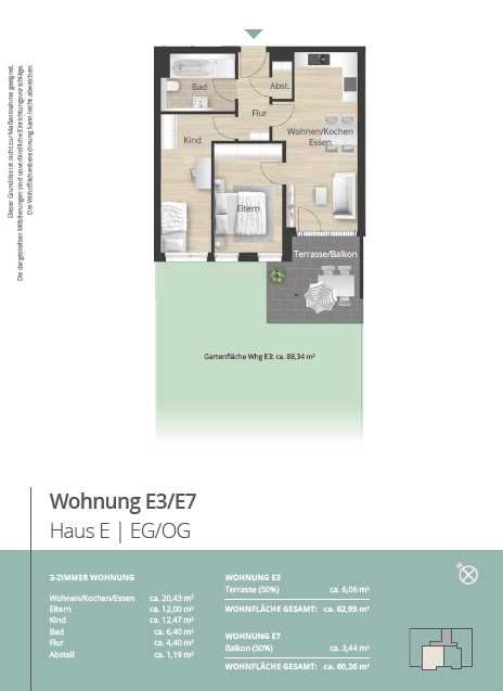 E3 - Kompakte und moderne 3 Zimmer EG-Wohnung mit großem Garten, offener Wohn-Essbereich uvm