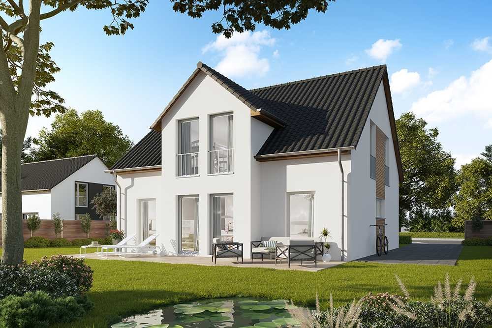 Die modern gestaltete Fassade wird durch zwei französische Balkone sowie die zweifarbige Gestaltung aufgewertet. Der offene Wohn-/Essbereich ist ein Lebensraum, der Träume vom großzügigen Wohnen problemlos erfüllt.
