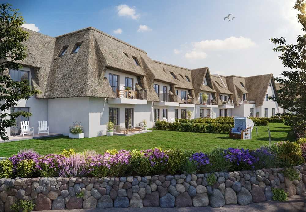Das Apartmenthaus Kranichsruh vereint 60 Apartments unter einem Dach, darunter Zwei- und Vierzimmerapartments sowie Dachgeschosswohnungen. Diese können sogar mit Dachterrassen punkten, die in das Reetdach integriert worden sind: perfekt zum Durchatmen und Entspannen und ein einmaliger Baustil!