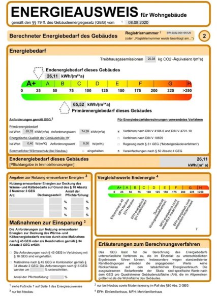| Endenergiebedarf: | 26,11 kWh/(m²*a) |