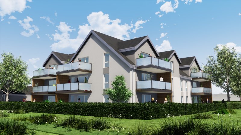 mit rd. 128 Quadratmetern Gartenfläche sowie einer rd. 12 Quadratmeter großen Terrasse und sonniger Südausrichtung. Die Wohnung wird in Fessenheim erbaut, innerhalb eines Mehrfamilienhauses mit 18 Wohneinheiten.