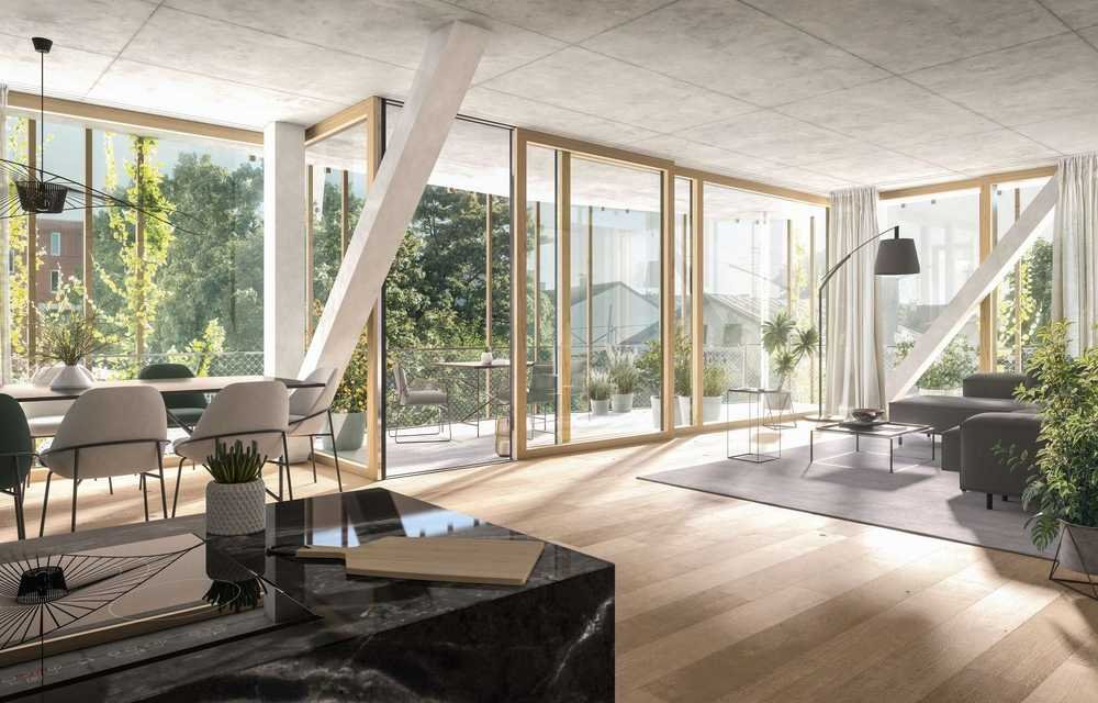 Eine natürliche Erweiterung des Lebensraumes: Alle Wohnungen sind nicht nur hell und leicht gestaltet, sondern lassen anhand großflächiger Glas und Schiebetüren innen und außen ineinanderfließen. Von den Holzdielen bis hinaus auf die Terrasse, die luftige Ausblicke und Auszeiten schenkt und dabei dennoch durch die filigrane Stabwolke und das Grün der Pflanztröge geschützt ist.