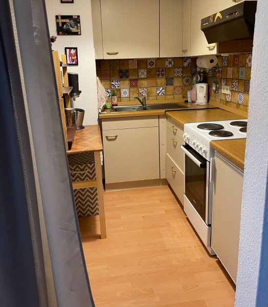 Die Wohnung verfügt über eine separate Küche mit Kühlschrank, Kochfeld und Backofen und ein Bad mit WC und Dusche.