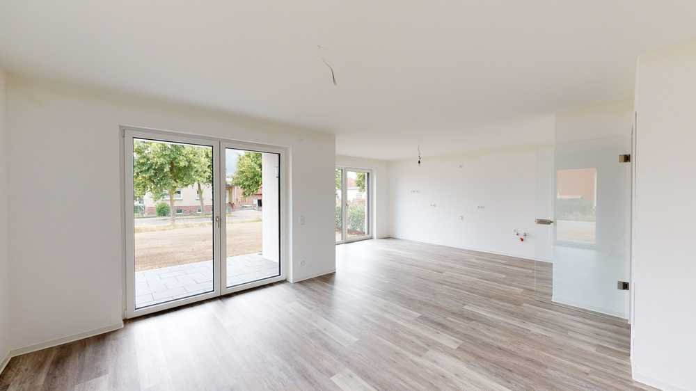 Die Wohnung (1.01) befindet sich im Erdgeschoss nach Osten gerichtet. Sie verfügt über einen offenen Wohn- und Essbereich, der einen direkten Zugang zur Terrasse bietet. Es sind zwei Schlafzimmer vorgesehen, wobei ein Zimmer als Büro oder Kinderzimmer genutzt werden kann. Jedes Zimmer, bis auf die Abstellkammer, verfügt über mindestens ein Fenster.