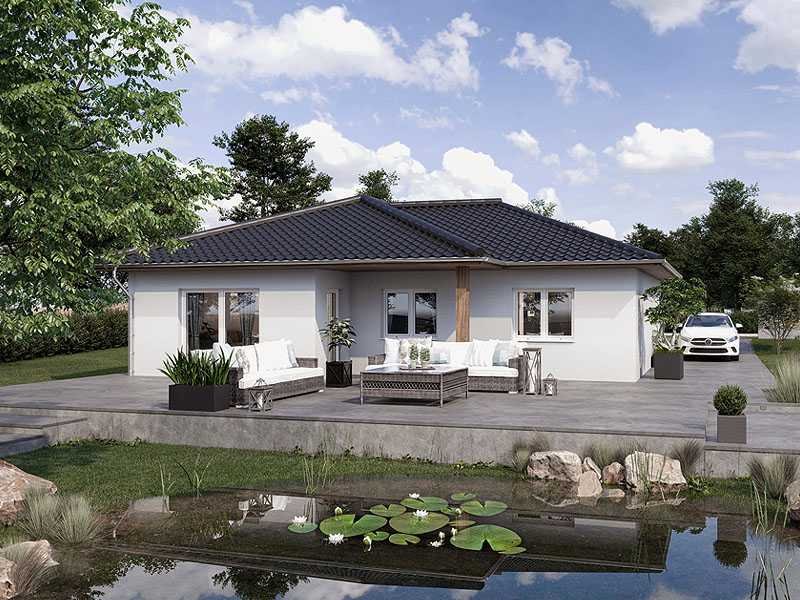 Unser Winkelbungalow Arendsee hat einen überdachten Terrassenbereich. Der offene Wohn-, Ess- und Kochbereich bietet Wohnen auf einer Ebene mit allen dazugehörigen Vorteilen.