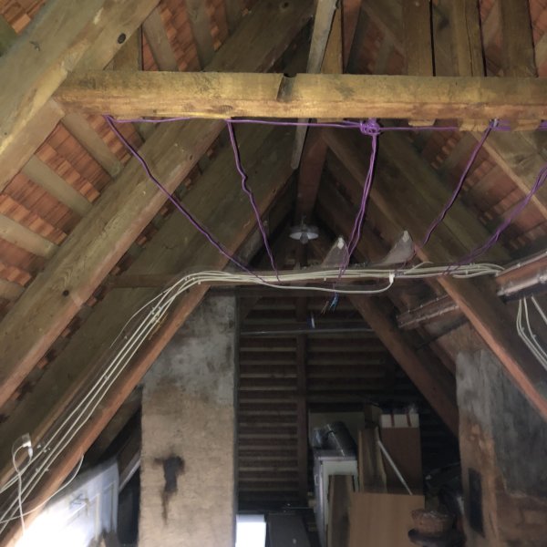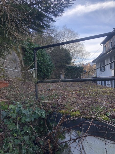 Das Haus hat eine solide Bausubstanz, ist voll unterkellert, hat Parkett- bzw. Dielenböden. Derzeit ist es aufgeteilt in vier Wohnungen auf vier Etagen: Im Erdgeschoss und im 1. Obergeschoss ist jeweils eine Drei-Zimmer-Wohnung (je 65 qm) mit Küche und TGL-Duschbad. Alle Zimmer gehen von einem Flur ab. Zwei der Zimmer sind außerdem durch eine Schiebetür verbunden. Die Räume haben schöne alte Dielenböden oder Parkettböden. Im Dachgeschoss ist eine Drei-Zimmer-Wohnung (54 qm) mit Küche und TGL-Bad. Im Untergschoss ist ein Studio (16 qm) mit Küchenzeile und TGL-Duschbad. Es gibt drei abschließbare Einzelgaragen. Auf das Garagendach führt eine Treppe, es ist begehbar und kann als Terrasse genutzt werden. Es gibt eine kleine Terrasse im Garten, Grünfläche und eine wunderschöne Rose. Das Dach ist sehr gut. Das Dachgeschoss könnte ausgebaut werden: Entweder als weitere wohnung oder um die Dachgeschosswohnung zu einer Maisonette-Wohnung zu erweitern. Das DG ist vermietet, die drei anderen Wohnungen sind frei. Etwa die Hälfte der Fenster ist neu. Die letzte Sanierung war 2012: Bäder, Küchen und Stromleitungen wurden erneuert. Das Haus hat eine ruhige Lage in einer Sackgasse, die im letzten Teil eine Privatstraße ist, direkt am Waldrand, mit weitem Blick über das Tal. Einkaufsmöglichkeiten, Bushaltestelle, Schulen, Ärzte, Gastronomie ist in Fußweite. Es gibt vielfältige Gestaltungsmöglichkeiten: als Heim für eine Familie, Mehrfamilienhaus, Wohnen und Arbeiten unter einem Dach.