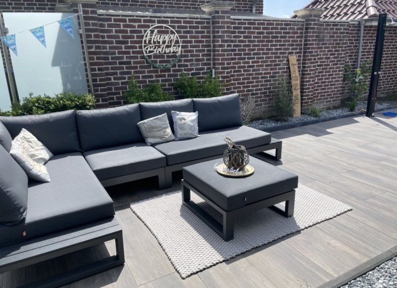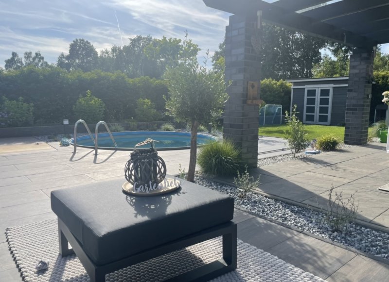 Schöner Garten mit Pool, Glasüberdachung und Markise