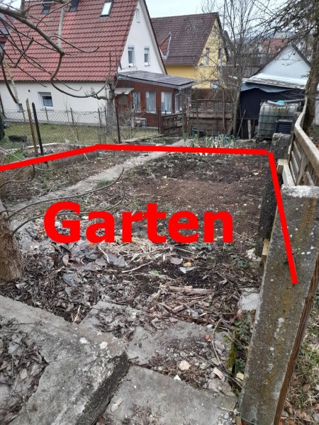 Der Garten ist ganz leicht vom Haus getrennt, er ist hinter den Garagen und ist (zusammen mit den Garagen) 129m² groß.