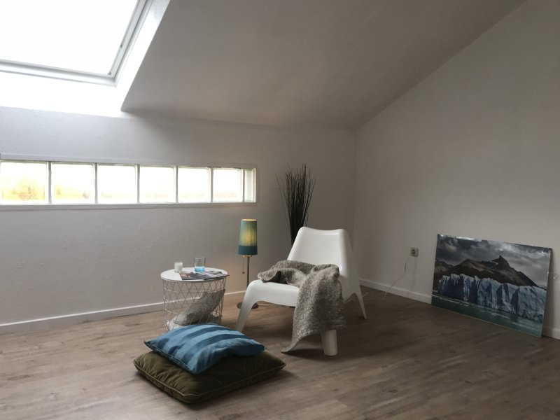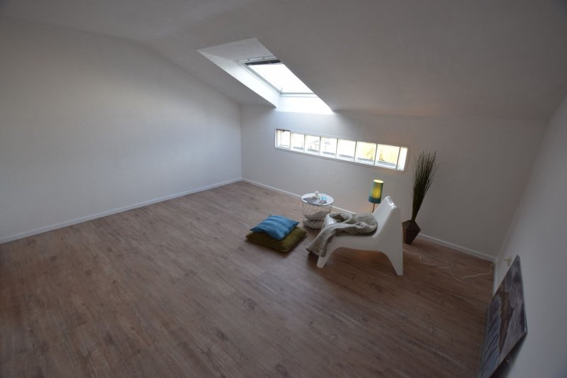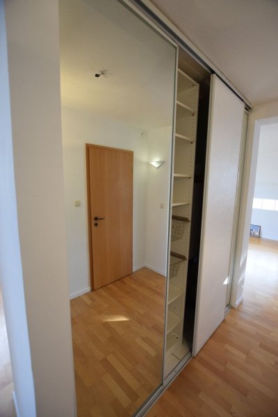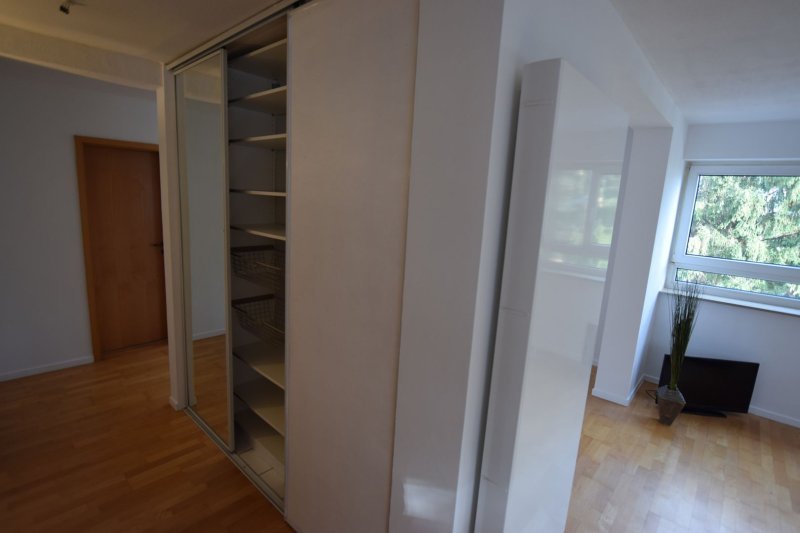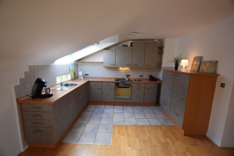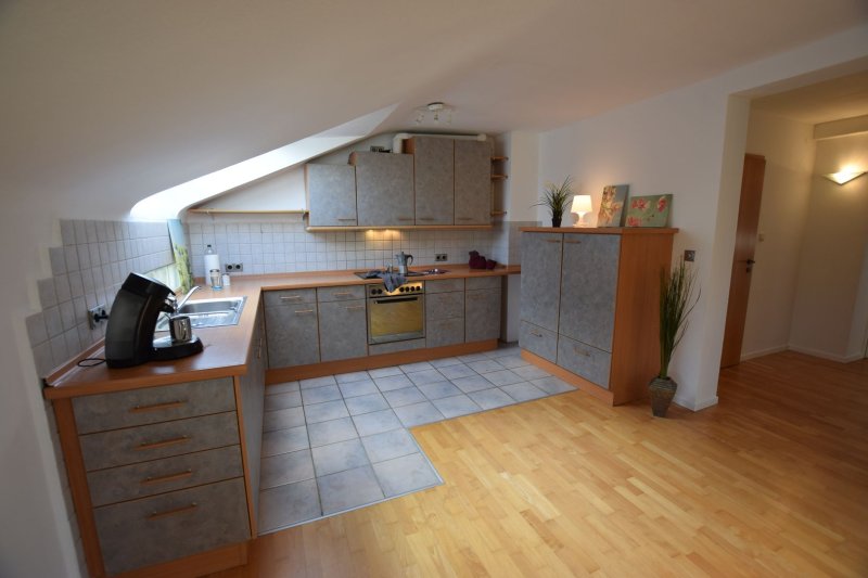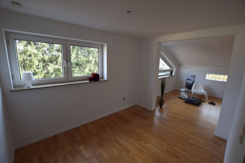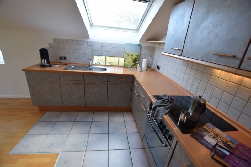 Zwei weitere Zimmer können als Schlafzimmer etc. genutzt werden. Die Fenster sind rundherum grosszügig platziert, sodass immer viel Licht in die Wohnung fällt, die Dachschräge sorgt für Gemütlichkeit schränkt die Bewegung im Raum aber nicht ein. Im Flur befindet sich ein grosser Einbauschrank mit viel Stauraum. Die Einbauküche bietet neben den Elektrogeräten ebenfalls viel Stauraum.