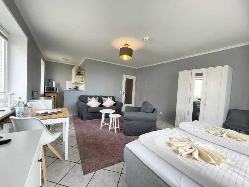 Geräumige und helle 1-Zimmer-Endwohnung mit vielen Fensterflächen. Großes Raumangebot durch die vorteilhaft in die Einheit integrierte Loggia. Breite Fensterfront (fast über die gesamte Raumbreite) in sonniger Westausrichtung mit Weitblick bis auf den Dünenkamm/Strandübergang. Geschickt, separierter Schlafbereich mit beidseitig begehbarem Doppelboxspringbett und 3-türigem Kleiderschrank. Bequemes 2-Sitzer-Sofa und Sessel. Essecke für 2 Personen am Fenster. Zum Wohnraum hin geöffnete, kommunikative Küchenzeile (mit Fenster) mit kleinem Tresen. Einladende Diele mit Garderobe und Spiegel. Davon abgehend: Hell gefliestes Duschbad mit WC.