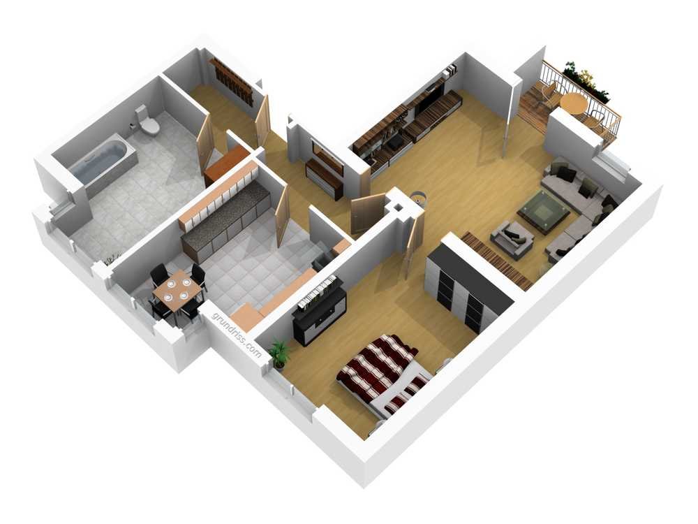 Bei klassischer Raumaufteilung erreichen Sie die Küche, das Bad und das Wohnzimmer über die Eingangsdiele. Das Schlafzimmer ist vom Wohnzimmer aus zugänglich.