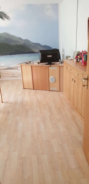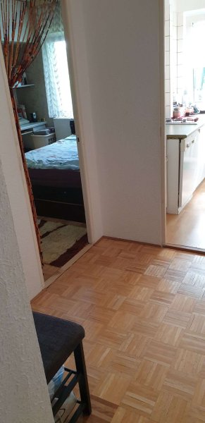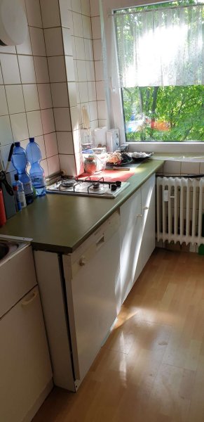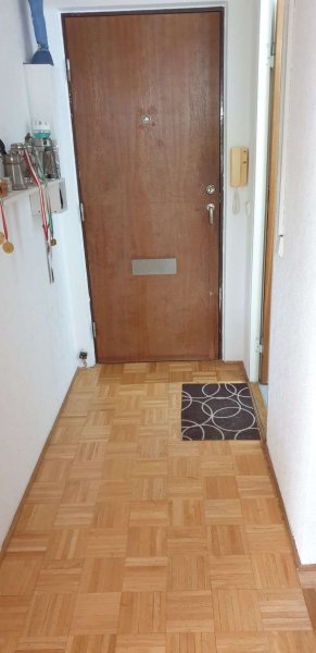 Der Boden im Flur und Schlafzimmer ist mit Riemchenparkett ausgestattet, Küche und das Wohnzimmer haben Laminatboden .