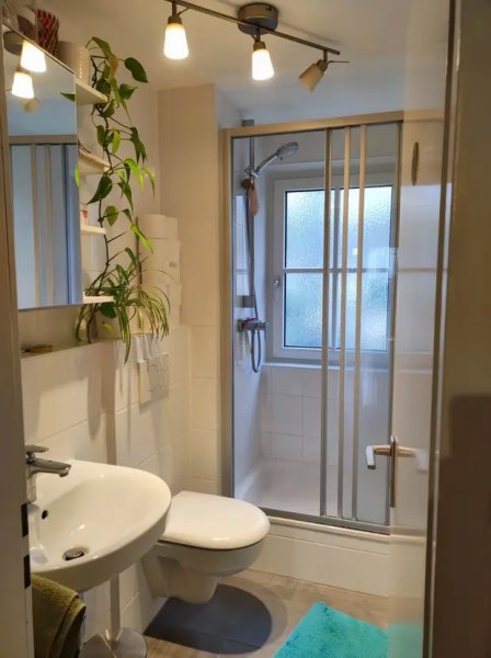 Das Badezimmer mit Dusche, WC, Handwachbecken, Waschmaschinenanschluss und Fenster lässt keine Wünsche offen.