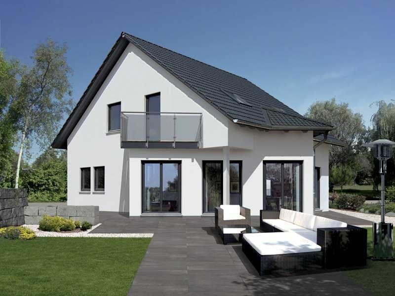 Durch die weiße Putzfassade kommen die anthrazitfarbenen Fensterrahmen gut zur Geltung und geben dem Haus in Kombination mit Holzlisenen am Giebel und einem Balkongeländer aus Glas einen modernen und frischen Charakter.