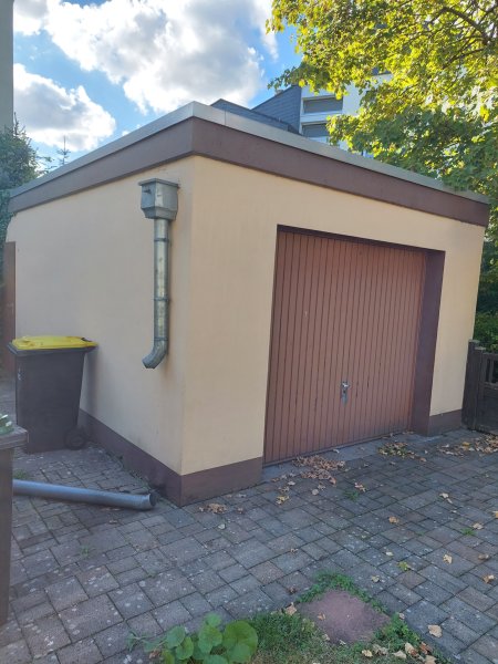 Zum Haus gehört eine große Garage mit einem großen Garagenvorplatz.